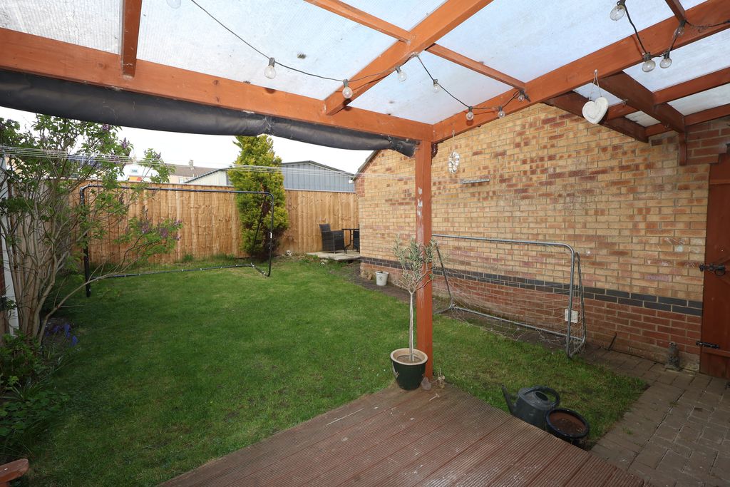 Rear enclosed garden with decking area.